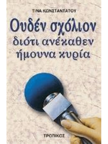 "...Θα πρέπει να διατηρήσετε την ψυχραιμία και την αξιοπρέπειά σας για να μην έχετε διαρκώς την εντύπωση ότι μιλώ για σας - χωρίς ούτε κατά διάνοια να περάσει από το κουρασμένο μυαλό σας ότι η αφήγηση περιέχει αυτοβιογραφικά στοιχεία σε ό,τι τυχόν διαβάσετε και σας απωθήσει, σας ενοχλήσει ή σας προκαλέσει κοροϊδευτικές διαθέσεις. Αντιθέτως, ομολογώ πως - ναι - εγώ κρύβομαι πίσω από τις λέξεις, ενέργειες και καταστάσεις που σας ξυπνούν το θαυμασμό και την καλοπροαίρετη ζήλια - ευχαριστώ." Πρώτη συγγραφική προσπάθεια της Τίνας Κωνσταντάτου, που με άφθονο χιούμορ και αυτοσαρκασμό καταθέτει την άποψή της, μα...πάντα κυρία!