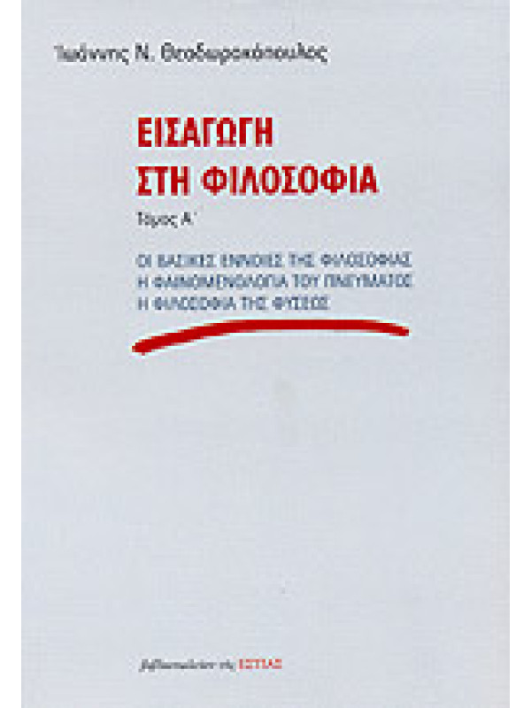 Η φιλοσοφία δημιουργεί πάντοτε μόνη της την έννοιά της. Συνεπώς δεν υπάρχει άλλο κριτήριο ανώτερό της για να κριθή και να ορισθή τι είναι φιλοσοφία. Μόνον τότε καταλαβαίνω τι είναι φιλοσοφία, όταν ζω ο ίδιος μέσα της, όταν δηλαδή φιλοσοφώ" σημειώνει προοιμιακά ο Ιωάννης Ν. Θεοδωρακόπουλος και αυτό ακριβώς ορίζει την ουσιαστική επιδίωξη της τετράτομης "Εισαγωγής στη φιλοσοφία": να οδηγήσει τον αναγνώστη της στο φιλοσοφείν. Φιλοσοφώ σημαίνει μετατρέπω σε ερώτημα αυτό που εκ πρώτης όψεως φαίνεται αυτονόητο και προφανές, και, με αυτή την έννοια, η φιλοσοφία δεν είναι μια δυσνόητη μάθηση που απευθύνεται σε έναν περιορισμένο αριθμό ειδικών, αλλά αφορά τον καθένα που αναρωτιέται για τον εαυτό του μέσα στον κόσμο. Η φιλοσοφία είναι η μοίρα του ανθρώπινου πνεύματος και η αξιοπρέπειά του. Κανείς ωστόσο δεν μπορεί να φιλοσοφήσει ουσιαστικά, χωρίς να γνωρίζει τα θεμελιώδη ερωτήματα της φιλοσοφικής παράδοσης, καθώς και τον τρόπο με τον οποίο τέθηκαν αυτά και συζητήθηκαν από τους μεγάλους φιλοσόφους - εξού και η μέθοδος της "Εισαγωγής" αυτής είναι ταυτόχρονα συστηματική και ιστορική. Ο Α΄ τόμος ειδικότερα εισάγει τον αναγνώστη σε βασικές έννοιες της φιλοσοφίας (υποκείμενο, συνείδηση, ψυχή, πνεύμα), στη φαινομενολογία της πνευματικής ζωής και τις αντινομίες της και, τέλος, στην ιστορία της έννοιας της φύσης από τους προσωκρατικούς ως τη σύγχρονη φυσική. (Από την παρουσίαση στο οπισθόφυλλο του βιβλίου)
